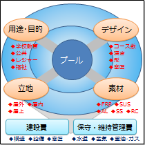 プールはその用途・材質・面積よって多様です。